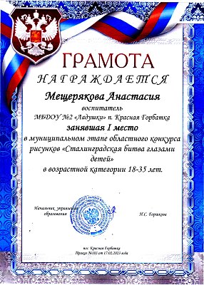 1 место в муниципальном этапе областного конкурса рисунков "Сталинградская битва глазами детей" возрастная категория 18-35 лет