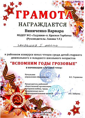 1 место в районном конкурсе юных чтецов среди детей старшего дошкольного и младшего школьного возрастов "ВСПОМНИМ ГОДЫ ГРОЗОВЫЕ" в номинации "Лучший чтец"